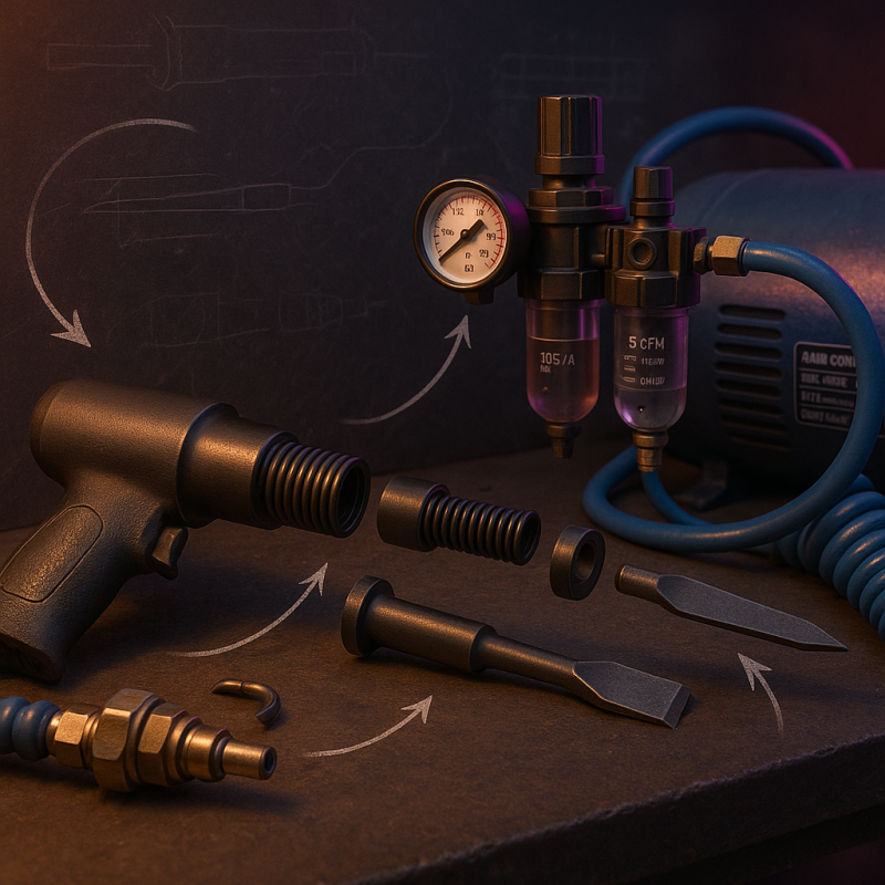 Пневмомолот превращает сжатый воздух в серии последовательных и жёстких ударов. Мы применяли его для демонтажа плитки и стяжек, кузовных работ, рубки металла, выколотки и клёпки. Чтобы инструмент «бил» как надо, важны четыре вещи: правильная подача воздуха, верный выбор насадок, достаточная производительность компрессора и чистая вода, правильно подготовленная магистраль.
