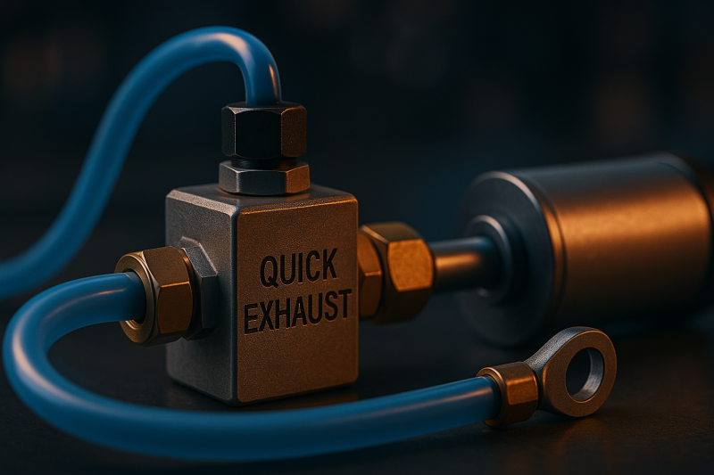 Особенно заметен эффект при выпуске воздуха. Вместо того чтобы возвращаться через распределитель и трубки, воздух выходит напрямую рядом с цилиндром. Давление в камере падает быстрее, и шток начинает движение без задержки. Такой принцип часто называют «ускоренным выхлопом», но на практике он решает сразу несколько задач — от повышения скорости до стабилизации работы.